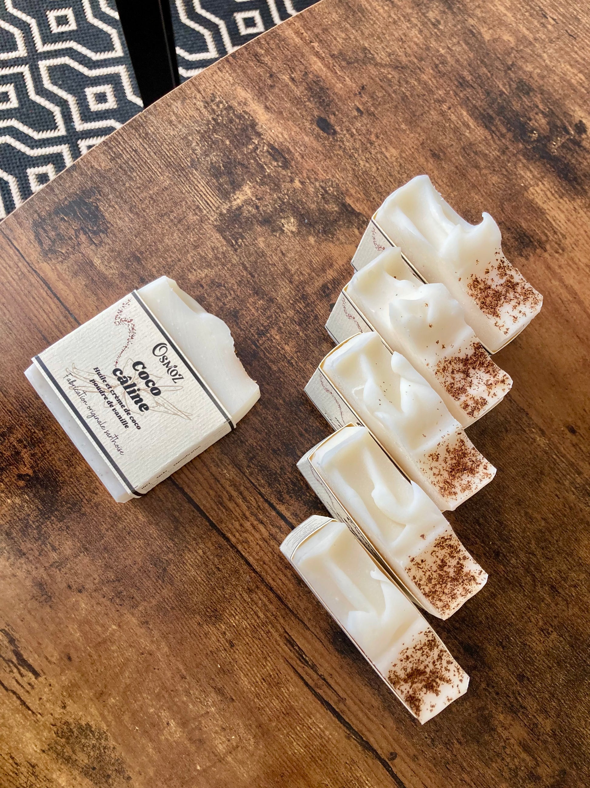 Savon surgras à 8%, réalisé en saponification à froid, le Coco câline, riche en beurre et crème de coco, vous emportera dans un moment de douceur.