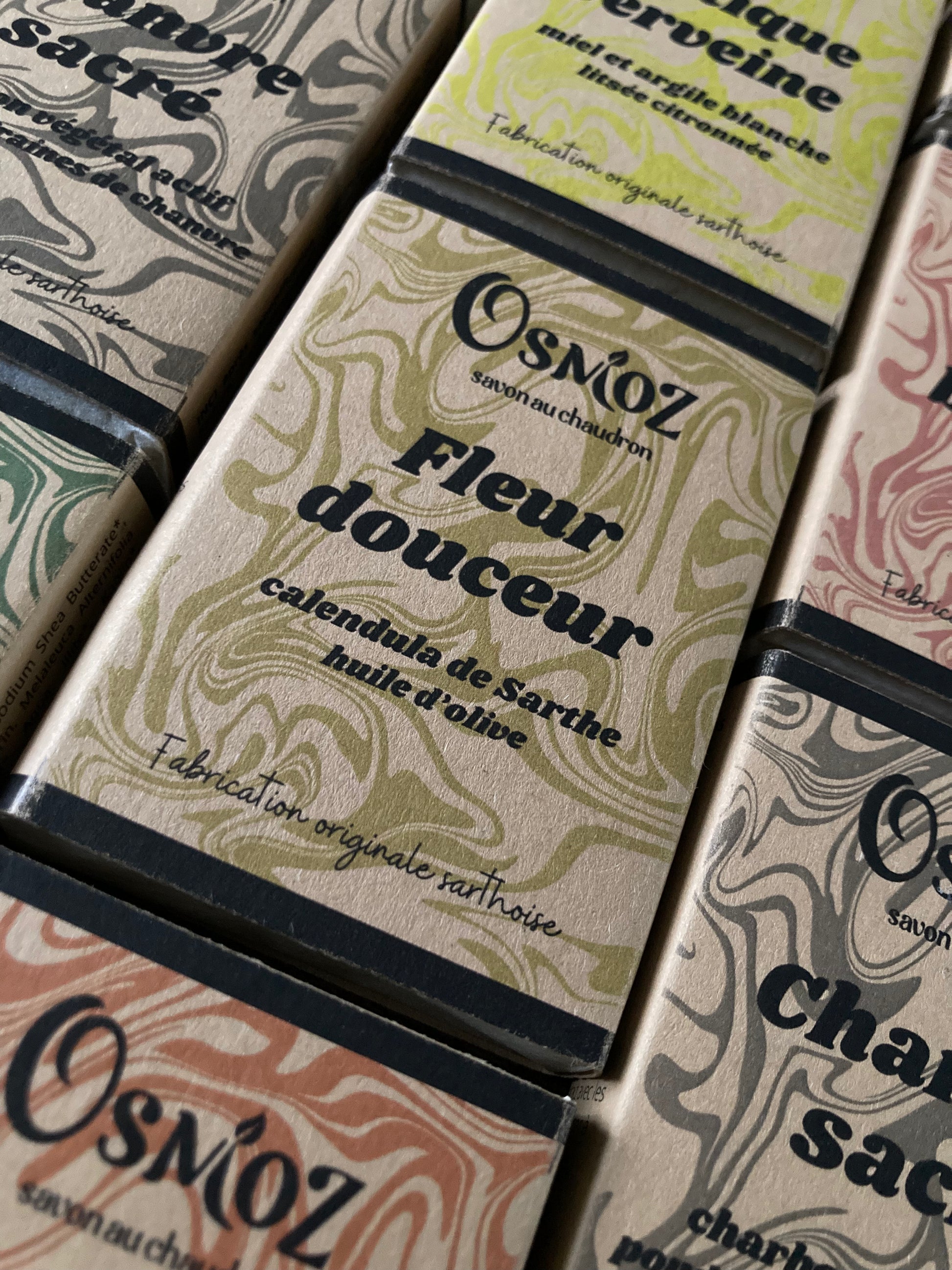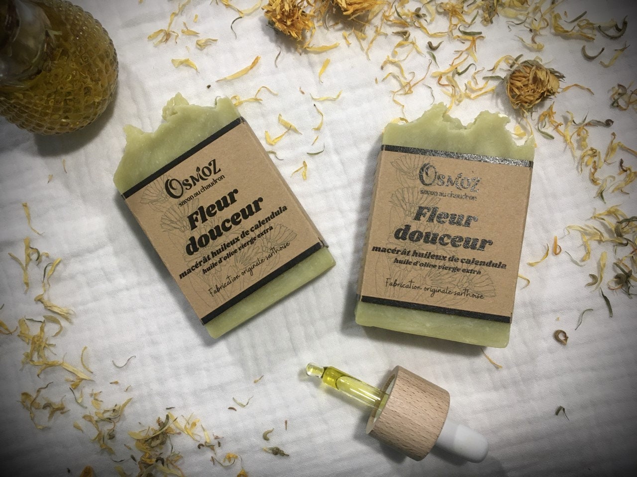 Enrichi en macérât huileux de fleurs de calendula (réalisé par la savonnerie) et en huile d'olive vierge extra.